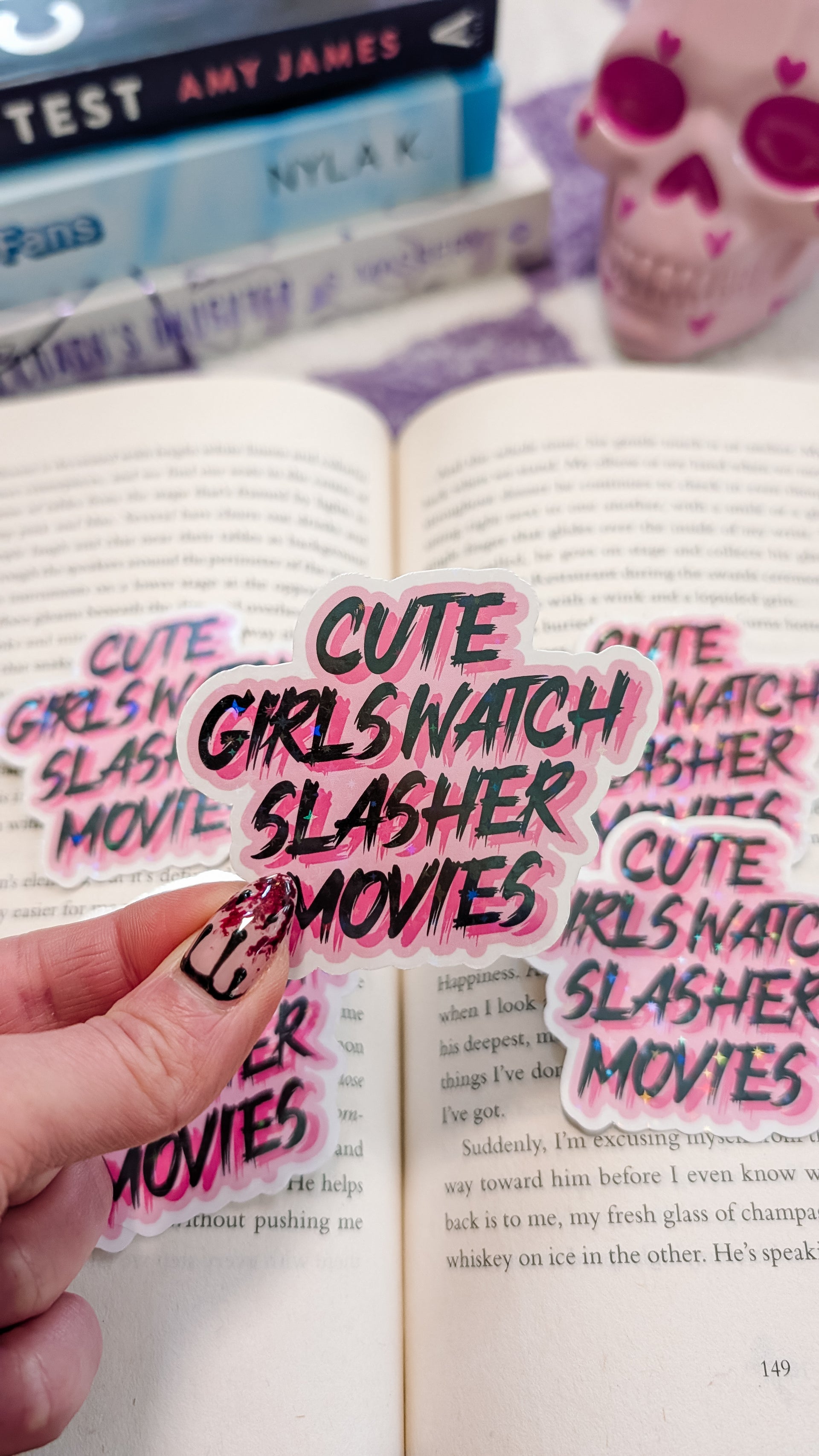 Cute girls watch slasher movies sticker (holographic)