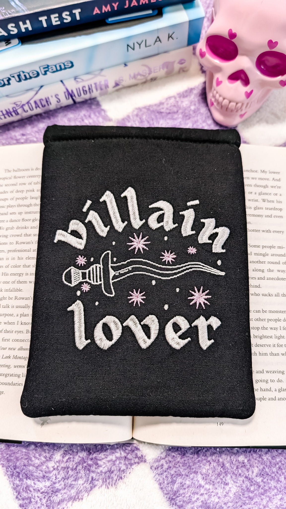 This cute little padded sleeve has an embroidered front with the words "Villain Lover" and a sword and the back has a nice two toned black with cream pocket!